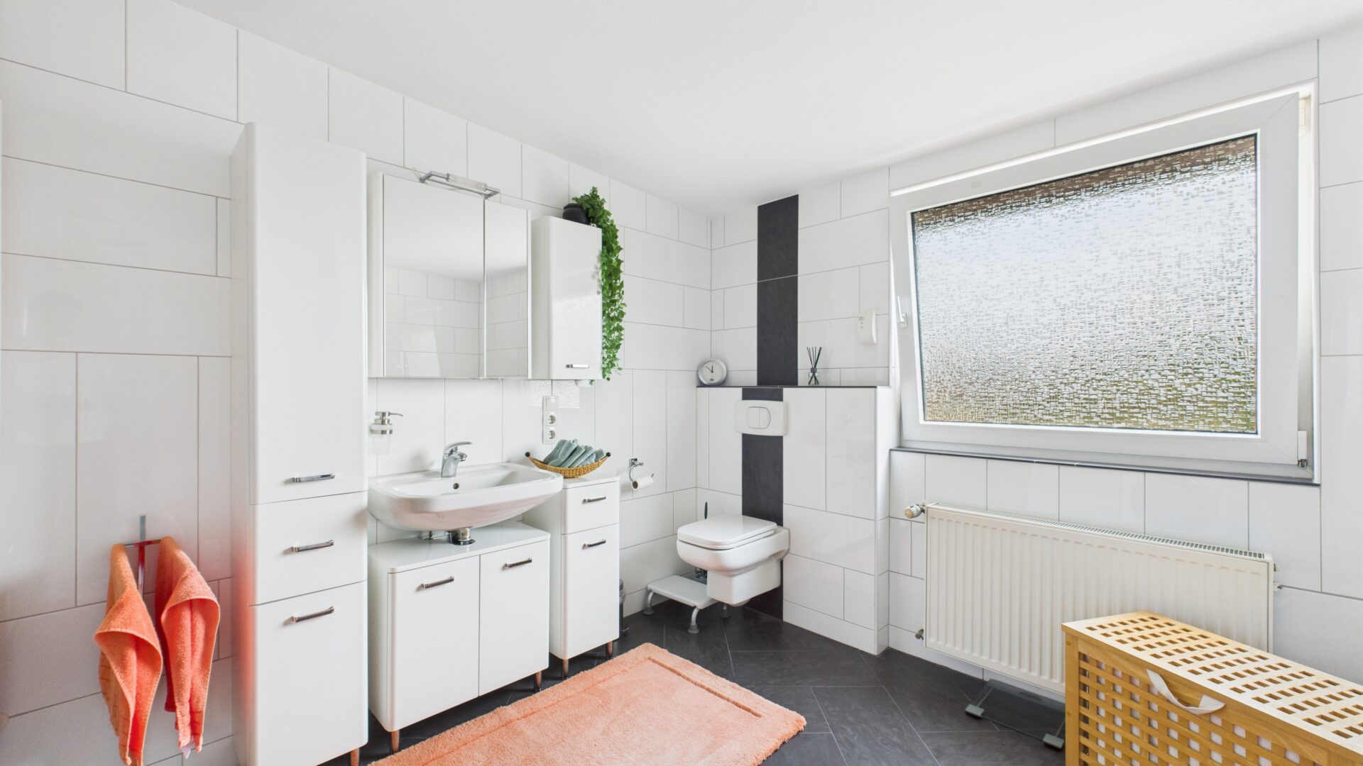 Das großzügige Badezimmer mit moderner Ausstattung lädt nach einem langen Tag zum Entspannen ein. Badewanne und separate Dusche wurden 2011 erneuert und sorgen für ein angenehmes Wohlfühlerlebnis. Praktische Details wie ein eigener Abstellraum und elektrische Rollläden runden das Wohnkonzept ab und bieten zusätzlichen Komfort.